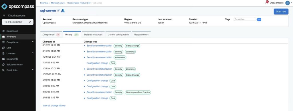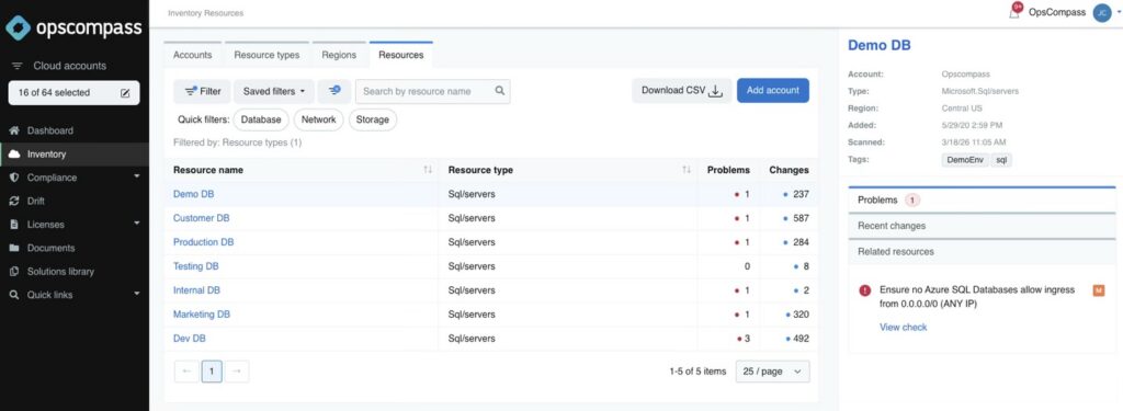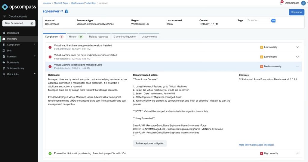 By implementing centralized SQL visibility and drift remediation using Opscompass, the organization gained a continuously updated view of every SQL resource across environments. When a new instance is created or a configuration changes, the platform flags the deviation from approved standards and flags those resources as out of compliance. Misconfigurations are identified early—often before end users or admin notice an issue—and remediation steps are clear and consistent. As a result, outages drop, audit preparation becomes routine instead of stressful, and operations teams regained confidence that their SQL environment is secure, compliant, and aligned with the business at all times.